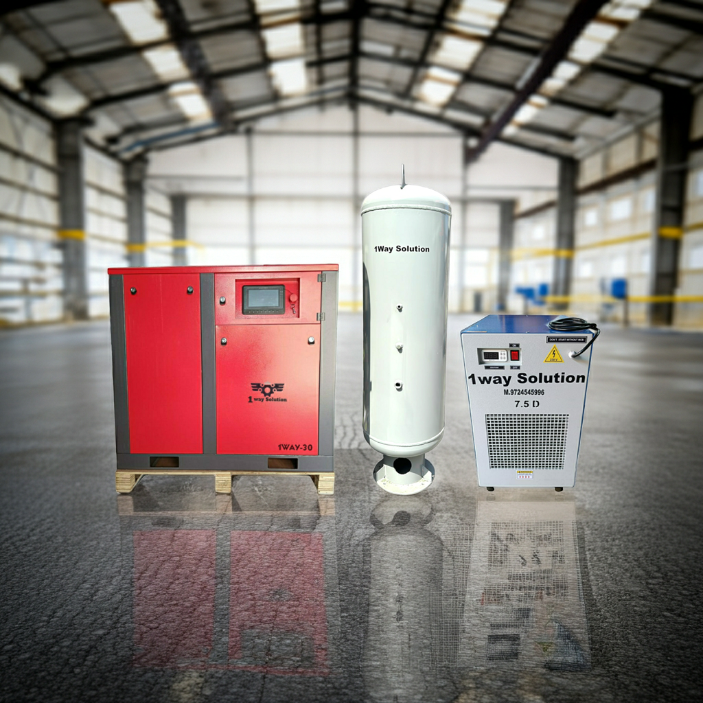 A Permanent Magnet Variable Frequency Drive (PM VFD) Screw Air Compressor is an advanced energy-saving compressed air system designed for modern industrial applications. It combines permanent magnet motor technology with variable frequency drive (VFD) to automatically adjust motor speed according to air demand. This intelligent speed control helps reduce energy consumption, maintain stable air pressure, and improve overall compressor efficiency. Compared to conventional fixed-speed compressors, PM VFD screw compressors can save up to 30–40% electricity, making them an ideal choice for industries looking to reduce operational costs. 1Way Air Solution offers high-performance PM VFD Screw Air Compressors designed for continuous operation, high efficiency, and reliable industrial performance. Key Features • Permanent Magnet Motor Technology for maximum efficiency • Variable Frequency Drive (VFD) for automatic speed control • Up to 30–40% energy saving compared to fixed speed compressors • Stable air pressure output • Soft start system to reduce electrical load • Low noise and vibration operation • Intelligent digital controller for monitoring and protection • Long service life with minimal maintenance Technical Specifications Power Range: 10 HP – 200 HP Pressure Options: 7 / 8 / 10 / 12 Bar Voltage: 415V, 3 Phase, 50Hz Cooling Type: Air Cooled Drive Type: Direct Drive Control System: Variable Frequency Drive (VFD) Applications PM VFD Screw Air Compressors are widely used in: • CNC Machine Industries • Laser Cutting Machines • Textile Manufacturing • Automobile Industry • Pharmaceutical Industry • Food Processing Plants • Packaging Industry Advantages of PM VFD Screw Air Compressor • Significant energy cost reduction • Stable compressed air pressure • Reduced mechanical wear and tear • Lower starting current • Improved system efficiency • Longer equipment life Why Choose 1Way Air Solution • Premium quality industrial air compressors • Energy efficient compressed air technology • Reliable and durable performance • Competitive pricing • Fast service and technical support